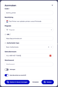 - Gebruikersnaam: vul hier je PrintNode-token in