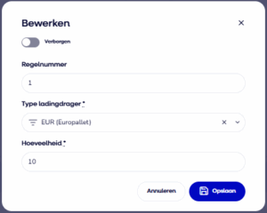 - Het standaard ladingdrager-type (bijvoorbeeld: pallet, krat, doos).
