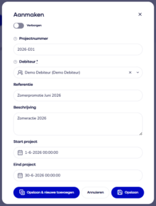 • Debiteur: de debiteur waarvoor het project wordt aangemaakt