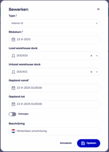 - Vul de ritgegevens in (type, datum, laad- en losdock, omschrijving).